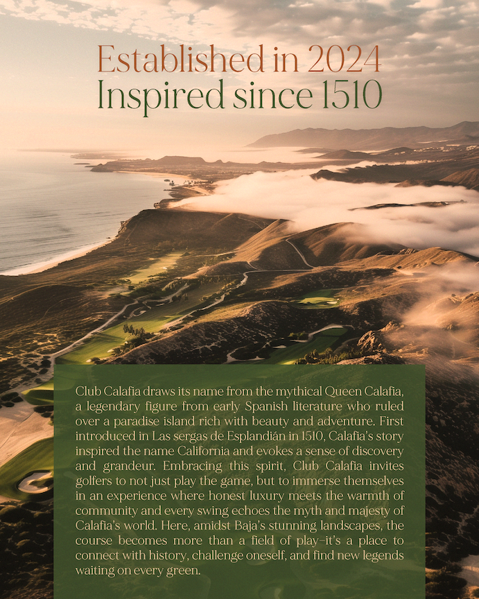 Club Calafia is a refined golf club that transcends traditional expectations, merging the legacy of Baja California’s rich history with a modern, understated luxury. Inspired by the legend of Queen Calafia and the rugged beauty of the landscape, the brand combines high-end sophistication with a warm, approachable elegance. The concept draws from natural earth tones, the mythic allure of discovery, and a sense of grounded authenticity to create an experience that feels both grand and welcoming. Here, golf isn’t just a game—it’s a journey, a chance to connect with the land and uncover a story that resonates with every swing